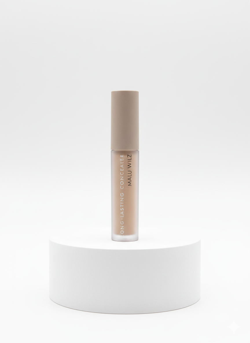 Mit dem Flockapplikator auf Augenringe, Linien und Unregelmäßigkeiten auftragen und mit den Fingerspitzen oder dem Malu Wilz Concealer Brush ausblenden.